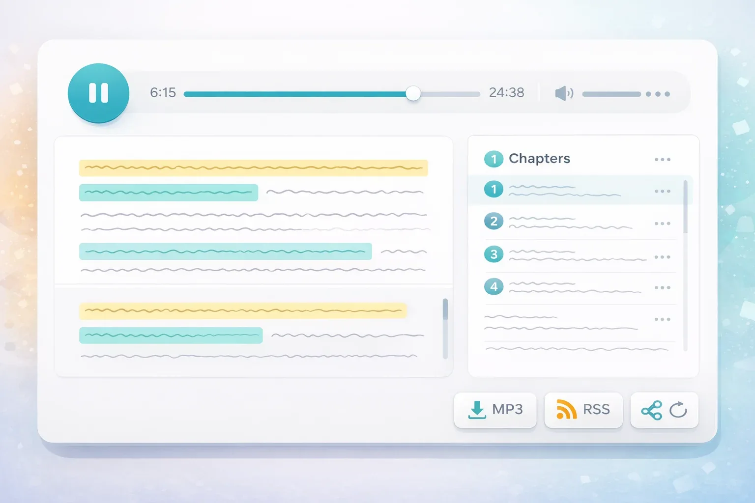 Vous convertissez des PDF régulièrement ? TurboCast ajoute chaque épisode à un flux RSS privé auquel vous pouvez vous abonner dans Apple Podcasts, Spotify, Overcast ou toute application de podcast. Votre flux s'enrichit automatiquement à mesure que vous ajoutez des documents — la façon la plus pratique de rester à jour sur vos listes de lecture.
