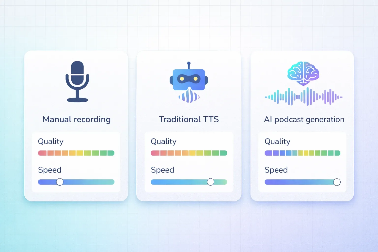 高速で安価ですが、結果は平坦です。標準的なTTSはテキストをそのまま読み上げます——括弧書きの補足説明、SEO重視のフレーズ、音声に変換しても機能しないセクション見出しも含めてです。リスナーはすぐに気づきます。