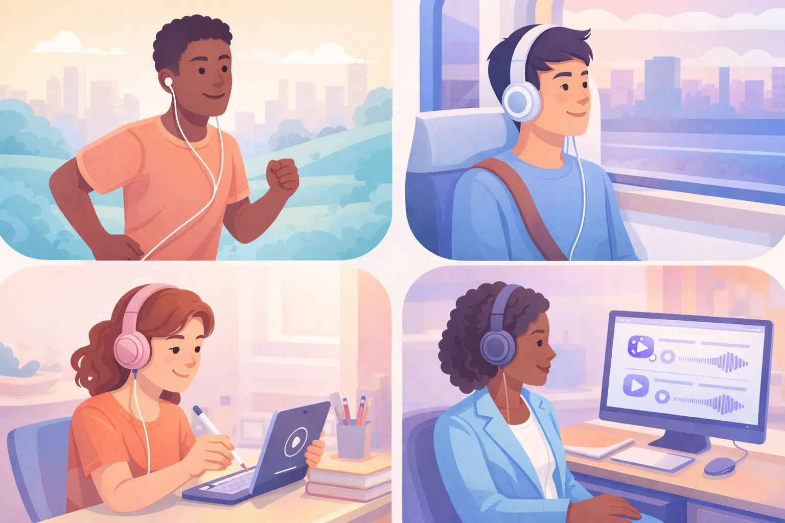 オンラインコースクリエイターは、レッスンの文字起こし、コースブログ記事、チュートリアル記事を補足音声に変換し、学生が復習中に聴けるコンテンツを提供しています。モバイルファーストの学習習慣に自然にフィットします。